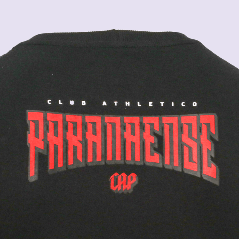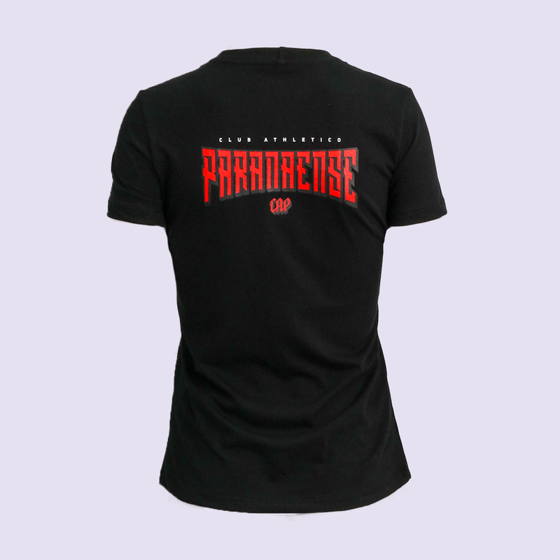 Camiseta feminina preta com estampa da evolução dos escudos do Athletico. Confeccionada em tecido confortável, ideal para uso casual no dia a dia.