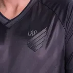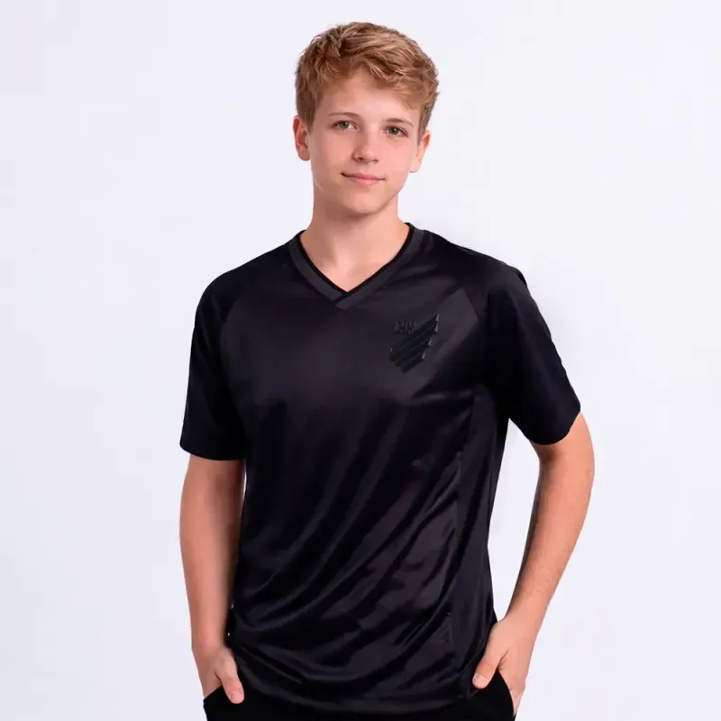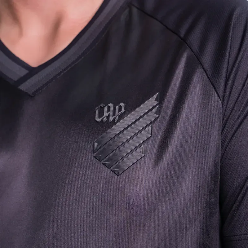 A gola em “V” com acabamento em retilínea trabalhada oferece um toque esportivo, enquanto o escudo do Athletico aplicado em TPU termoaplicado com relevo valoriza a identidade do clube. O ícone caldeirão em serigrafia termocolante na barra reforça o visual rubro-negro.