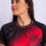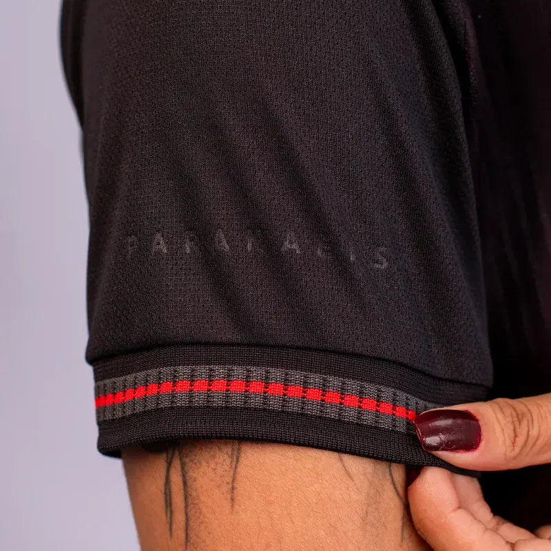 O destaque fica por conta da arte sublimada na parte frontal, com efeito em vermelho que cria um visual impactante e moderno. O escudo em TPU termoaplicado reforça o acabamento premium, enquanto a gola e os punhos em retilínea oferecem ajuste confortável e elegante.