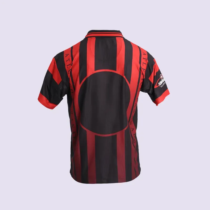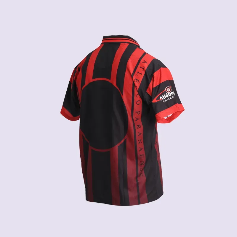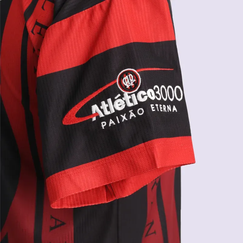 A Camisa Retrô 1999 Rubro-Negra Juvenil celebra grandes conquistas. Faz reverência à inauguração da Arena e título da Seletiva em 1999, e à disputa da Libertadores em 2000. Composição 100% poliéster. Jacquard exclusivo, tecnologia Dry, sublimação rubro-negra, gola e punhos retilíneos e escudo bordado marcam o design do relançamento dessa peça importante na história do Club Athletico Paranaense.