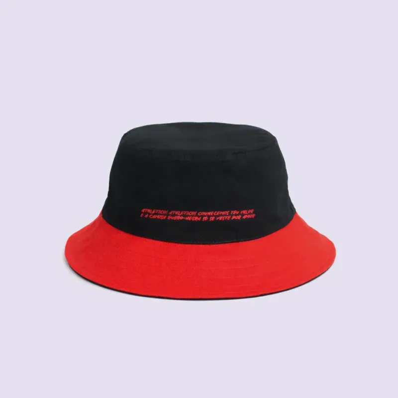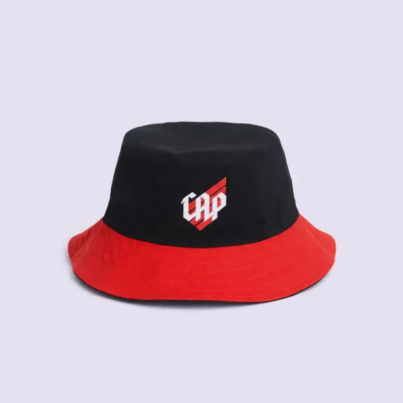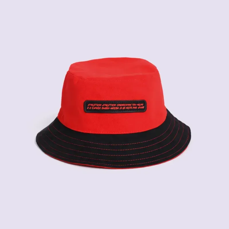 Chapéu bucket Athletico, com design dupla face, oferecendo versatilidade de uso em cores vermelho e preto.